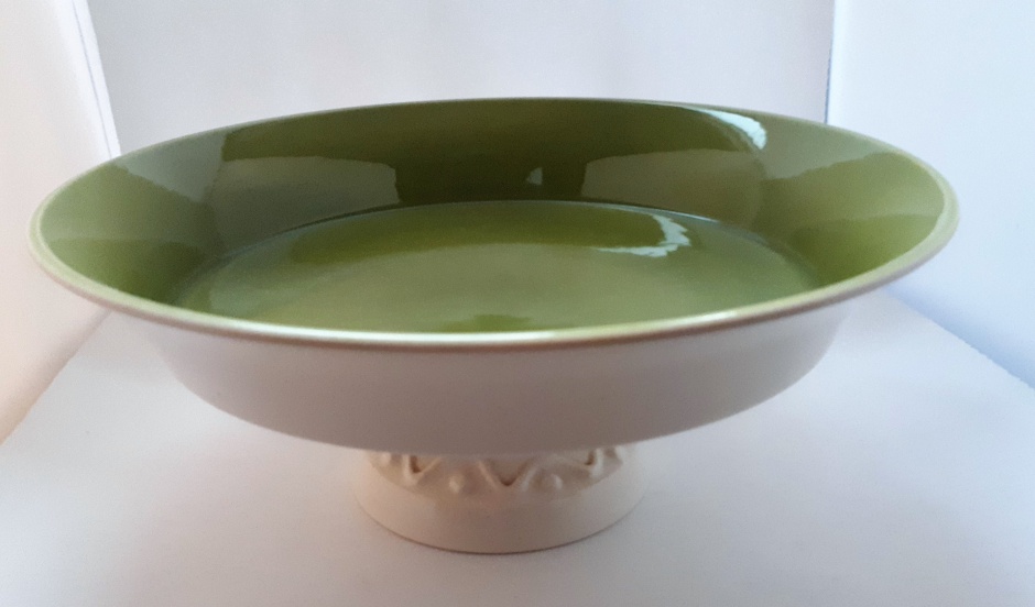 Fris Edam, witte fruitschaal op voet, binnenzijde groen geglazuurd