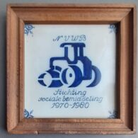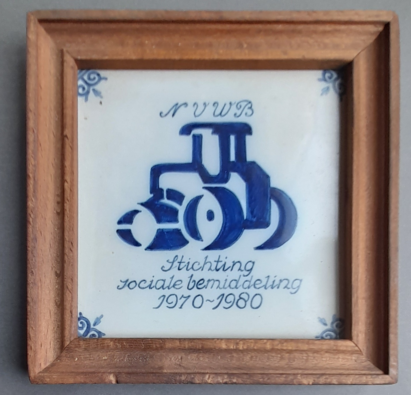 Hierbij een tegel van Makkumer aardewerk: Stichting speciale bemiddeling 1970-1980 in eikenhouten lijst.