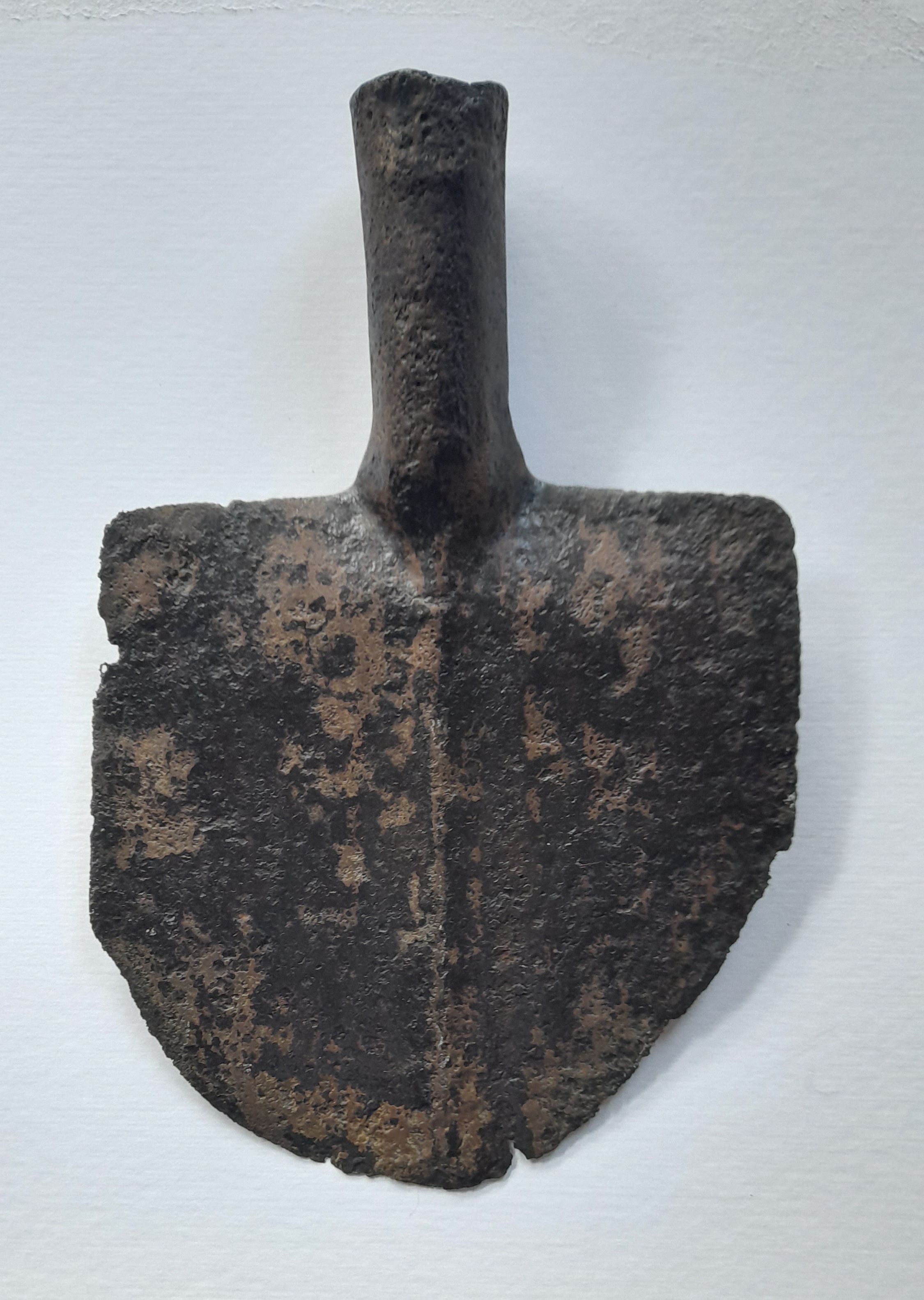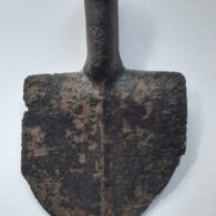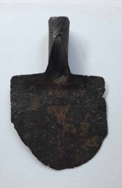 Gegoten handgesmede schop, geconserveerd Vroeg Nieuwe Tijd Afkomstig uit de gracht van Huize Den Berg Afm. Br x Ho. 20 x 31,5 cm.