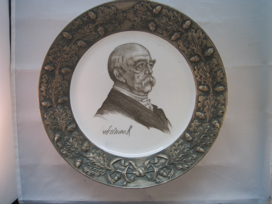 Patriottische Teller mit versilberten Messing Eichenlaubrand Darstellung Fürst Otto Von Bischmarck E.S.A.G. Durchm. 25,5 cm wie neu