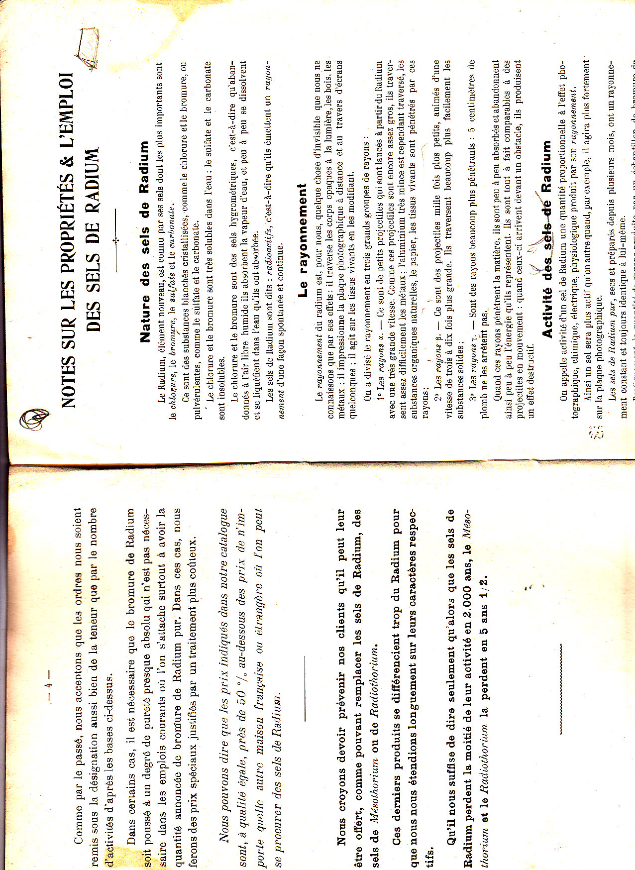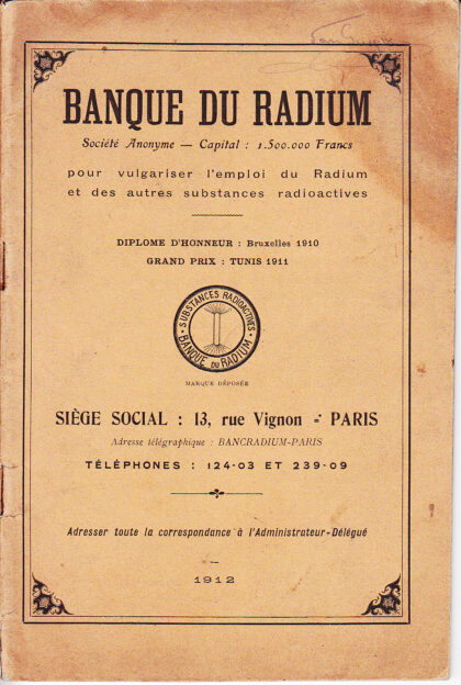 Banque du Radium - Paris Pour vulgariser l'emploi du Radium et des autres substances radioactives. Size: 16 x 24 cm, 31 pages