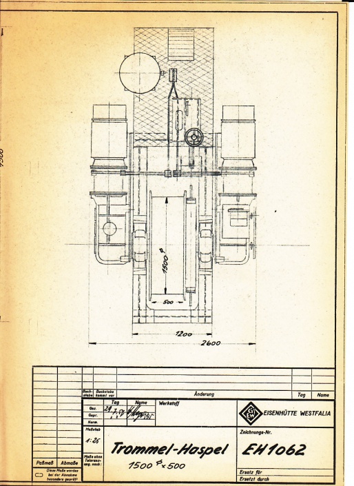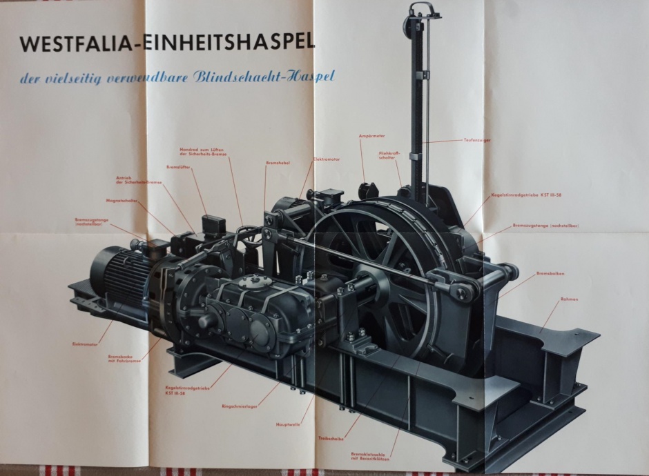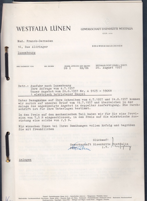Bergwerkmaschinen In map, size: 23 x 32 cm. With original letter, dated 28 August 1957 Lieferungsbedinungen Drawing A-3 from Trommel-Haspel Flyer: Westfalia-Einheitshaspel 59 x 42 cm.
