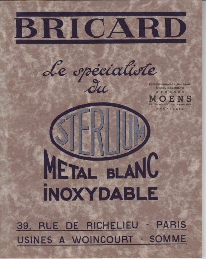 Bricard Paris - Sterlium Metal Blanc Moens - Bruxelles Bequlles, Bouttons,Entrées,rosettes,porte mateaux Date: 1938 Size: 21 x 27 cm. - 16 pages with original letter from Moens and pricelist