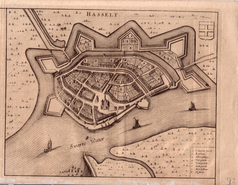 Kopergravure van de stadsplattegrond van Hasselt Uit de atlas:Teatro Belgico datering 1690 Afm. 25x20 cm