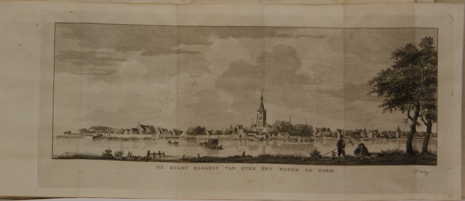 Kopergravure van de stadt Hasselt van over het Zwarte Water gezien afm. 40 x 15 cm datering 1790 Ingelijst
