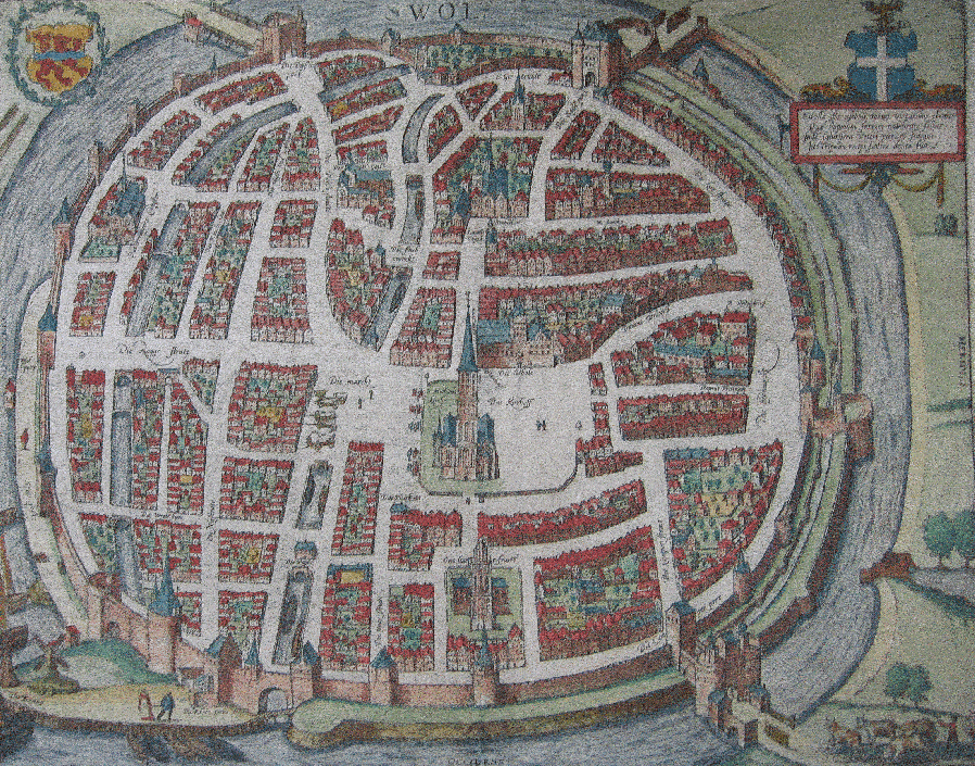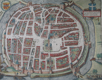 Kopergravure, stadsplattegrond van Zwolle afm. 43 x 34 cm, mooie inkleuring uit: Atlas Civitatis orbis Terrarum, datering 1582 Stadswapen rechtsboven en Provinciewapen linksboven ingelijst
