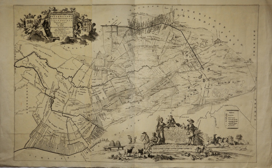 Kopergravure van Opsterlandt De Achtste Gretenije van de Zevenwolden Getekend door Bernardus schotanus à Steringa uitgegeven door F. Halma in 1718 Afm. 53,5 x 83 cm.