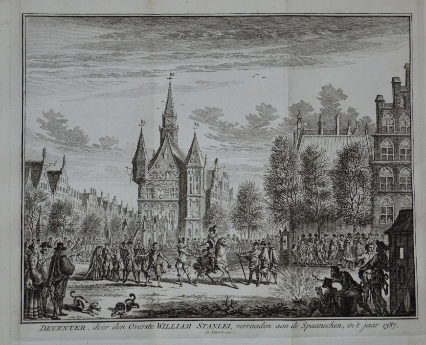 Kopergravure van het verraad van Wiliam Stanley aan de Spanjaarden Gravure van Simon Fokke 1782-1784 Afm. 20 x 16 cm. Vouwen als uit het boek